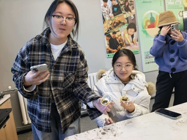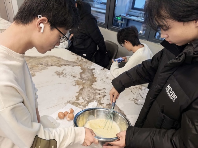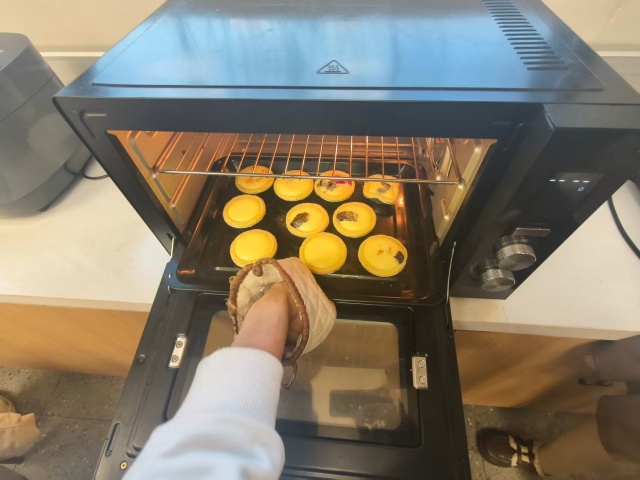 在简单介绍了蛋挞的制作步骤和注意事项后,同学们迅速按分好的组行动起来。打鸡蛋,搅拌,过筛……整个过程有条不紊,欢声笑语不断,真不愧是“不基础美食博主”。有的同学手法娴熟,俨然一副“大师”模样;有的则略显生疏,但在朋友的帮助下也渐渐找到了感觉。当一盘盘盛满蛋液的蛋挞皮小心翼翼进入烤箱,大家都满怀期待地围在烤箱旁,透过玻璃观察着“蝴蝶的蜕变”。