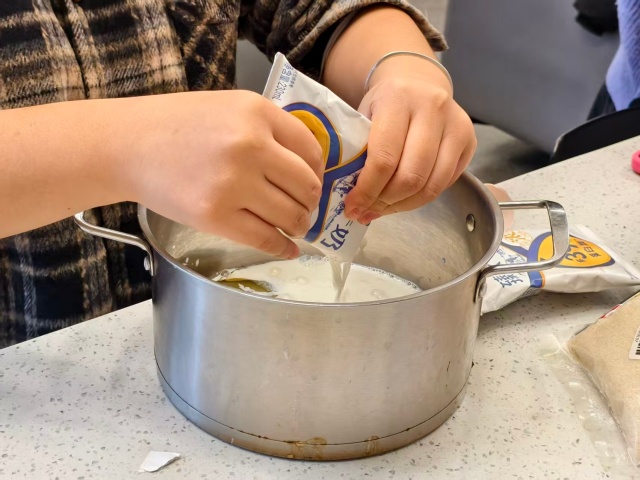 活动伊始,班委们已将提前采购好的蛋挞皮,纯牛奶,淡奶油,鸡蛋,白砂糖等食材分发给同学,专业的烘焙器材也早已“蓄势待发”,为各位“不基础美食博主”能“大展拳脚”提供了坚实保障,大家都摩拳擦掌,跃跃欲试。