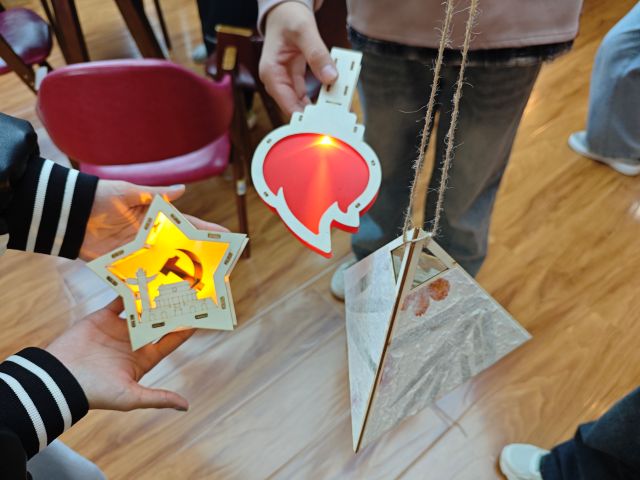 活动伊始,书院活动室里处处洋溢着喜庆氛围。组委提前采购彩纸、竹篾、画笔、丝带等材料,还特意准备了剪刀防护套、胶水分装瓶等工具,确保每位同学安全创作。灯笼制作环节,同学们自发组队、默契配合。一组同学率先拿起竹篾,指尖轻捏慢调,将细篾弯成圆润的灯笼骨架,每一处接口都用细绳仔细缠绕固定,生怕一丝松动影响整体形态。另一组同学伏案裁剪红色彩纸,剪刀起落间,祥云的弧线、五角星的棱角、天安门的轮廓渐渐清晰,随后小心翼翼地将剪好的图案贴在灯笼素面上,让喜庆的元素慢慢铺满灯身。同学们在便签纸上写下“国泰民安”“繁荣昌盛”的字样,裁成精致吊牌,轻轻系在灯笼下方的挂绳上,风一吹便微微晃动,满是灵动的祝福。李同学格外用心,他不仅在灯笼侧面细细绘出万里长城的蜿蜒雄姿,还特意添上了家乡的电视塔地标,“我想把家乡这些年的新变化,和祖国的大好河山画在一起,这样才是我心里最鲜活、最美的中国。”
