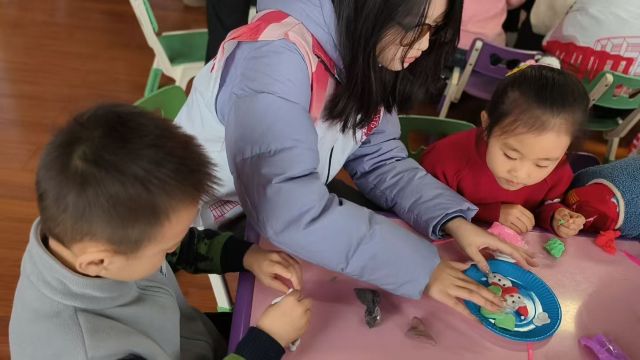 活动中,志愿者们化身“创意助手”,耐心引导小朋友发挥想象。有的孩子想做雪人,志愿者就手把手教他们揉制圆形黏土,搭配黑色纽扣当眼睛、红色黏土做鼻子;有的孩子偏爱雪花,志愿者便帮忙用工具压出花瓣纹理,让“雪花”在纸盘上绽放;还有的孩子脑洞大开,把不同颜色的黏土混合,创造出独一无二的“彩虹雪人”。18双大手牵着42双小手,在揉捏、粘贴的过程中,原本空白的纸盘渐渐变成了一个个充满童趣的作品,活动室里满是“老师你看”“我做好啦”的欢快声音,与午后的阳光交织成最温暖的画面。