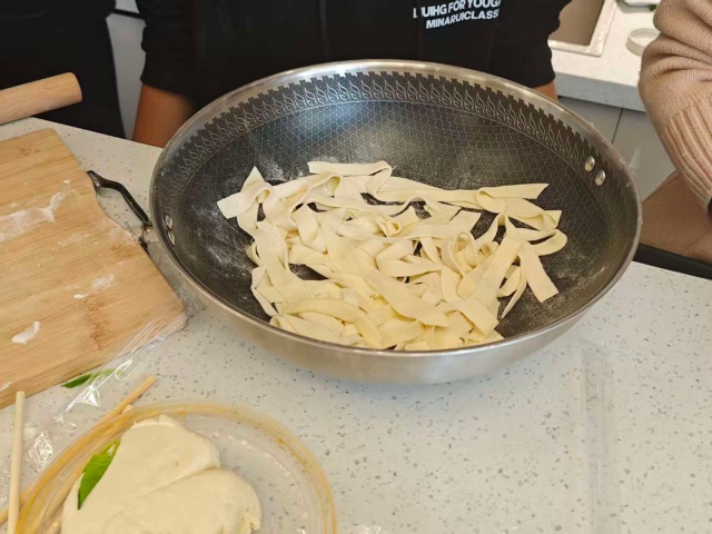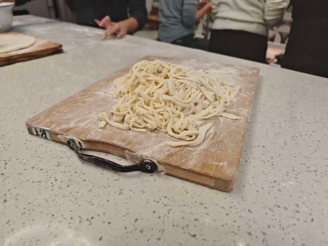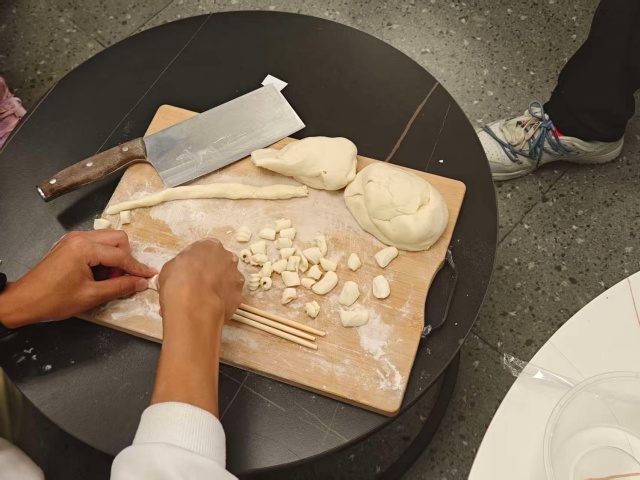 跃跃欲试。团支部为大家准备了充足的面团、工具及番茄、炸酱、酸汤等多元浇头,同时贴心提供线上制作教程供参。擅长手工的同学率先尝试传统技法:手握弧形削面刀,在面团上平稳起落,一片片厚薄均匀的面条顺势落入沸水中;指尖翻飞间,不起眼的面团被搓成小巧玲珑的猫耳朵,形态逼真惹人喜爱。对于初次尝试的同学,大家相互请教、耐心指导,从面团软硬的把控到削面力度的调整,从揪片大小的均匀度到莜面栲栳栳的卷制技巧,在一次次尝试与调整中,同学们逐渐掌握要领,脸上洋溢着收获的喜悦。此外,团支部还鼓励大家发挥创意,用食用色素调制出色彩斑斓的面团,DIY 出卡通形象、花鸟图案等趣味作品,让普通的面食制作成为展现想象力与创造力的舞台。当一碗碗热气腾腾的面条出锅,浇上心仪的浇头,同学们围坐在一起品尝自己的劳动成果,麦香与调味交融,欢声笑语萦绕在厨房的每个角落。“这是我第一次亲手做刀削面,虽然形状不够标准,但吃起来格外香!”“通过自己动手,才真正体会到传统面食制作的不易与匠心 ”,同学们边吃边分享着参与感受,在味蕾的满足与实践的乐趣中,进一步拉近了与传统文化的距离。