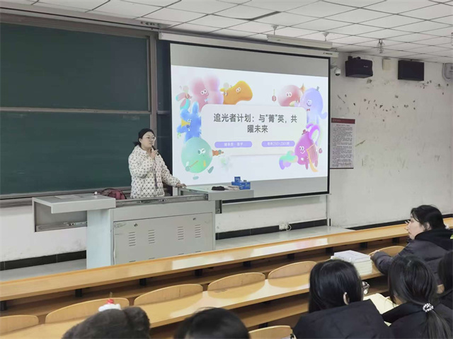 辅导员宿宇老师以一种近乎朋友谈心的方式,重新校准了“追光”的坐标。“我们聚集于此,首先需要共识:我们所要追寻的‘光’,究竟是什么?”她站在台前,目光扫过每一张年轻而专注的面孔。“追光者”,第一步是“看见”——看见光芒之下,与你我无异的血肉之躯;第二步是“理解”——理解这光芒并非天赋异禀的燃烧,而是持续努力聚焦后必然产生的亮斑。最终,我们渴望的是共鸣与激发——他们的存在,证明了路径的可行,而我们内心的火种,正等待被这实证的火花所引燃。