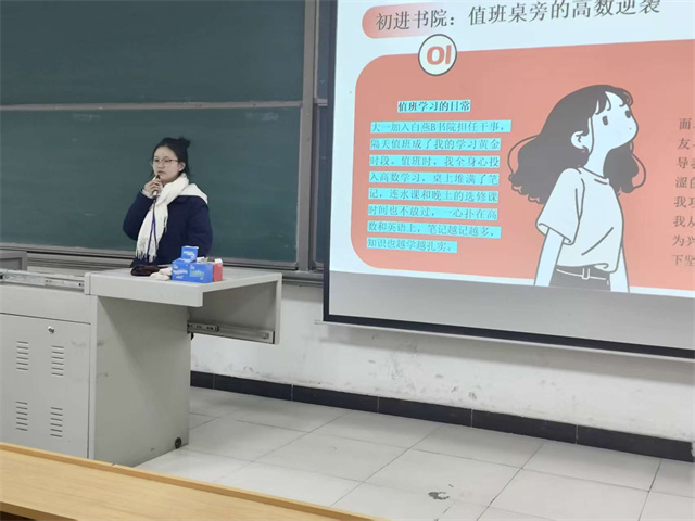 当榜样的形象变得具体而亲切,活动便自然进入了更具“干货”属性的核心环节——经验的方法论拆解。财务2304班张勤同学主攻学习系统的架构与优化。她以自身从时间混沌到效率自主的进阶为例,系统阐述了“三维驱动法”:将每日切割为不同的精力区间,匹配相应难度的学习任务,而非单纯堆砌时长。强调了“周度诊断”与“错题价值深度挖掘”的闭环,让每一处漏洞都成为知识网络强化的契机。