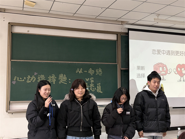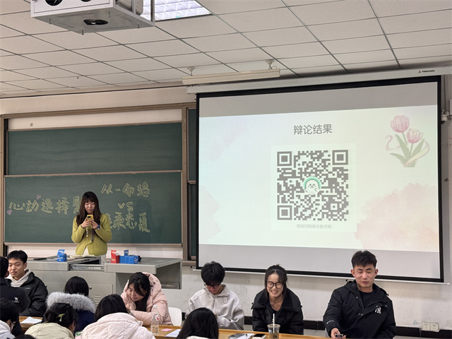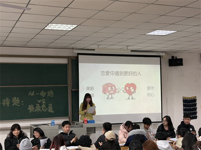 这绝对是活动的“高光环节”!四个班级各推选2名代表担任辩手,组成“果断选择队”和“坚守初心队”,围绕“当代大学生恋爱中遇到更好的人:果断选择VS坚守初心”展开唇枪舌战。