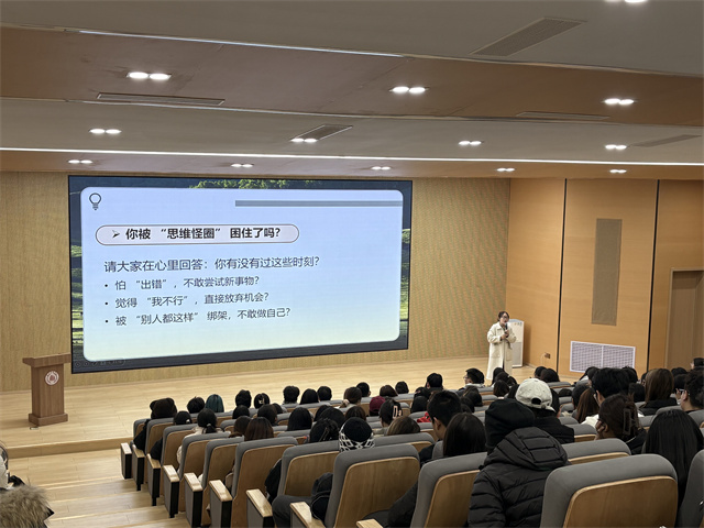 互动的余温尚未散去,杨永华老师便将话题切入学生成长的核心痛点,大屏上的灵魂拷问“你被‘思维怪圈’困住了吗?”如一声警钟,瞬间让喧闹的会场归于沉静。“怕出错就拒绝尝试新事物,把‘我不行’挂在嘴边,直接放弃本该抓住的机会;被‘别人都这样’的群体心理绑架,宁愿随波逐流,也不敢坚持做自己”,三个扎心问题精准戳中当代青年的共性迷茫,学生在自我对照中直面内心的怯懦与盲从。