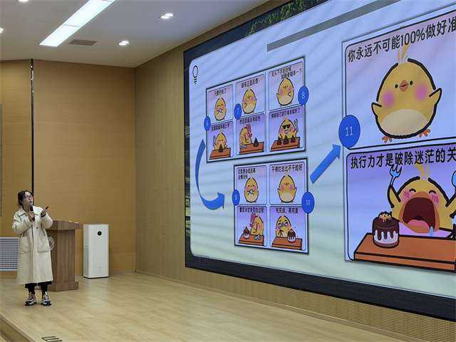 互动的热烈过后,杨永华老师将节奏放缓,为学生带来暖心的成长指引,消解他们对“目标迷茫”的焦虑。她展示了一组治愈系趣味漫画:一只小鸡从“站在原地迷茫,不知道该学什么技能”,到“鼓起勇气尝试,哪怕做得磕磕绊绊”,再到“坚持摸索后,技能突飞猛进”,生动诠释了“不必追求完美开局,行动才是破局关键”的道理。
