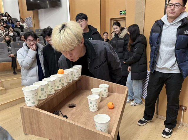 为让“破局”与“尝试”从思想走向实践,杨永华老师精心设计“乒乓逐风挑战赛”,现场随机叫学号,邀请两组学生依次上阵,需将乒乓球从装满水的纸杯列首吹至列尾,用时最少,且球不掉落的小组获胜。