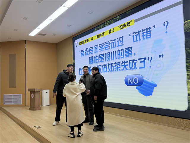 现场学生分享自己的“试错”经历:第一次做奶茶失败,第一次上台演讲紧张忘词,甚至只是第一次主动和陌生人交流,这些看似微小的尝试,都是对抗‘甩锅’的勇敢举动。”
