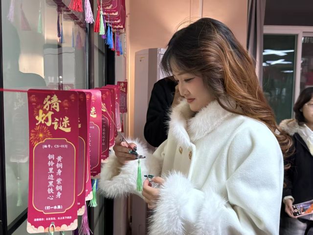 而接下来的猜灯谜环节则是同学们的智慧博弈同样充满班级联欢趣味。五彩斑斓的灯谜纸条如彩带般挂满教室两侧的细绳,谜题不仅涵盖民俗典故、诗词名句、生活常识,瞬间勾起了大家的兴趣。同学们或独自蹙眉沉思,或三五成群凑在一起小声探讨,偶尔有人灵光乍现喊出答案,得到班委肯定答复后,便会雀跃地领取积分卡片,还不忘和身边人分享解题思路。