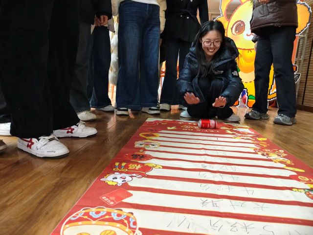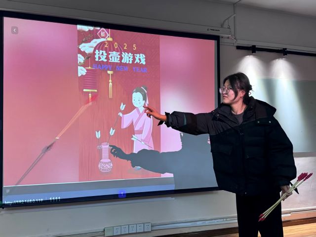 活动伊始,投壶区便率先成为全场联欢焦点。红蛇的投壶静静立在舞台中央,十数支竹制箭羽整齐排列一侧,负责该环节的班委正以轻松诙谐的语气为同学们讲解投壶规则,还特意加入了 “宿舍组队 PK” 的班级专属联欢玩法。同学们摩拳擦掌,各个宿舍迅速组队展开对决,未上场的室友在一旁扯着嗓子呐喊助威;有的同学弓步站立、眼手合一,箭羽脱手后精准入壶,引得宿舍全员起身欢呼;有的同学初次尝试,箭羽屡屡擦壶而过,却在室友的打趣与手把手指导下继续挑战,终于成功投中时,兴奋得与全宿舍成员击掌拥抱,冬日的寒意也在这充满班级情谊的欢声笑语中消散无踪。