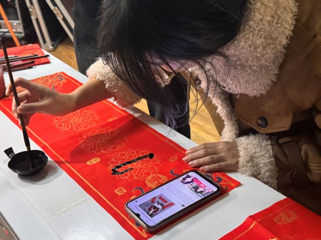 书法区氤氲着温馨的联欢雅致。长条案台上,优质宣纸红底对联、狼毫毛笔、徽墨砚台一应俱全,班级里书法功底深厚的两位同学化身“指导老师”,手把手传授握笔姿势与运笔技巧,还特意准备了小巧的迷你书签纸,适配班级联欢会的轻松氛围。同学们提笔便尽显功底,腕间发力、笔锋流转,“天增岁月人增寿,春满乾坤福满门” 等吉祥春联跃然纸上,墨香混着宣纸的清新气息,在空气里晕开新春的诗意;书法新手们则小心翼翼地描摹,即便笔画略显歪斜,却字字饱含心意,有人写下“平安喜乐”的书签赠予同班挚友,有人将“万事顺遂”的迷你书签卡贴在室友的保温杯上,还有人特意为家里人写下一句祝福语,这些带着温度的笔墨,成了班级联欢会上独属于这个冬日的珍贵信物。