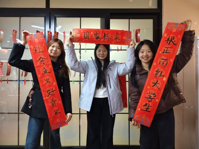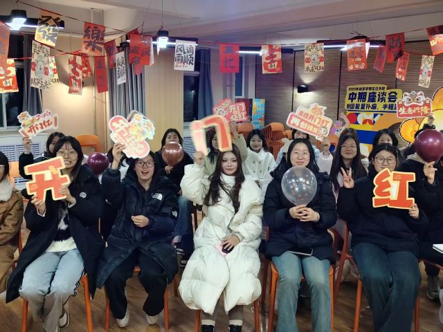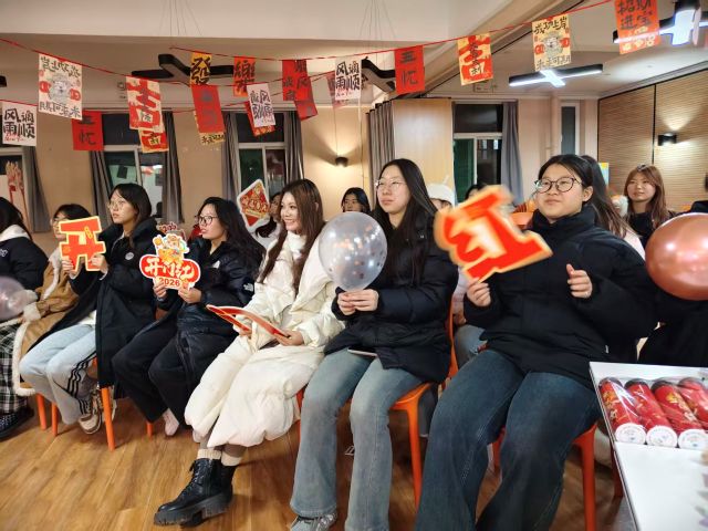活动尾声,全体同学自发围成一圈,齐声唱响《春风十里报新年》熟悉的旋律在晚风中回荡,有人跟着节奏轻轻摇摆,有人举起手机记录这欢乐时刻。大家捧着春联、礼品与饮品,在联欢主题背景板前定格合影,一张张笑脸上洋溢着满足与喜悦。活动渐渐落下帷幕,不少同学仍犹未尽。
