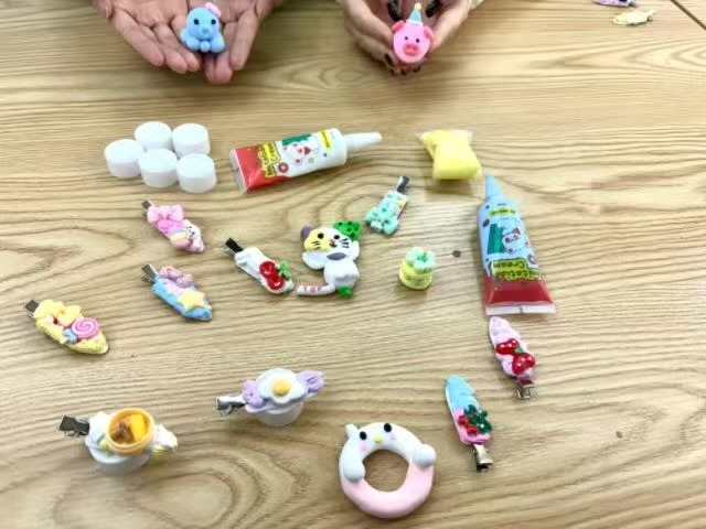 这边的奶油胶创作区,简直是“颜值担当”聚集地。大家拿着发夹底座当画布,挤出顺滑的奶油胶,画出波浪纹、小爱心、花边等各种俏皮图案,再往上粘星星、雪花、小麋鹿这些冬日小配饰,有的同学还撒上闪粉、贴上小珍珠,普通的发夹立马变得blingbling,少女心爆棚。有几位女生还玩起了“主题创作”,有人做了“冬日雪国”系列发夹,堆满了小雪球和松树配饰;有人则偏爱可爱风,在发夹上粘满了卡通小熊和糖果装饰,每一款都让人爱不释手。完成作品的同学还会举着发夹互相“炫耀”,时不时发出“哇,你的也太好看了”的惊叹声。
