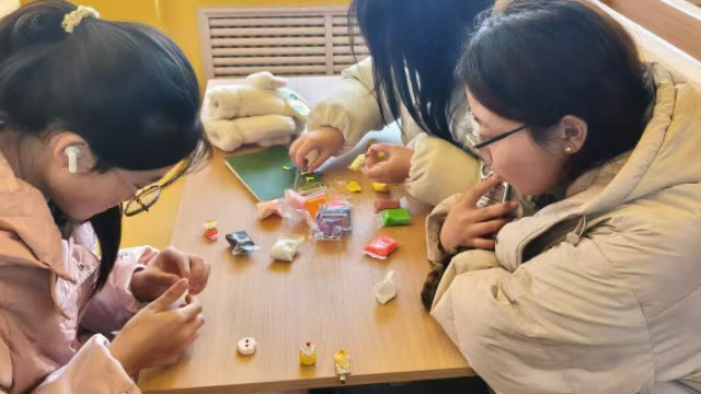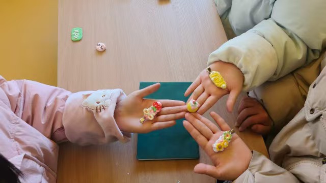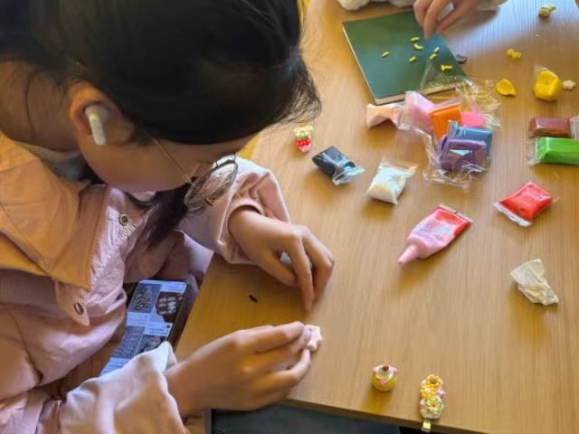 讲解刚结束,同学们就迫不及待地冲去领材料,瞬间进入创作模式。原本安安静静的共享区,一下子变成了超热闹的“冬日创意工坊”。奶油胶挤出的滋滋声、揉搓黏土的沙沙声,和同学们的欢声笑语交织在一起,别提多欢乐了。