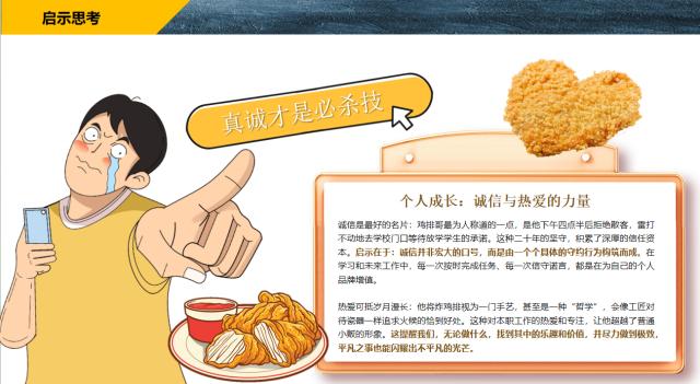 活动开场,任凯悦老师以景德镇“鸡排主理人”的爆火故事切入,瞬间吸引了学生:“这个6元鸡排卖出满格情绪价值的摊主,走红密码是最朴素的真诚。”任老师深入剖析其爆火核心逻辑:无剧本的真实表达、稀缺的真诚态度,以及与景德镇陶瓷文化的自然契合,让他在过度包装的网红经济中成为一股清流。“他将炸鸡火候与陶瓷烧窑技巧类比,把小生意做成了文化表达;用二十年坚守兑现承诺,把普通摊位打造成诚信标杆。”任老师强调,无论是经营事业、人际交往还是未来职场发展,真诚都不是可有可无的品质,而是穿越浮躁、赢得长远认可的“必杀技”。通过对比现象级素人网红与传统网红的差异,她指出“反套路、人情味、坚守本心”是这类网红深受追捧的共同特质,也是真诚品格的生动体现。