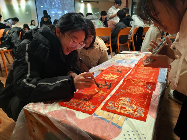 为让创作更具新意,活动还展示了3个“非传统创意版对联”案例:有上联画4个小人围坐吃火锅、下联写“下次聚餐还AA”并横批贴零食贴纸的趣味设计;有上联写“周一早起起不来”、下联画打哈欠表情包且横批书“求室友叫醒”的真实写照;还有上联用室友名字首字母拼成短句、下联绘一起去过的地方简笔画的温情创作。这些案例让同学们打开了创作思路,大家纷纷拿起毛笔书写、挥动彩笔绘画、剪下杂志图案拼贴,在红纸上勾勒属于宿舍的独特印记。擅长书法的同学主动帮身边伙伴调整字体结构,书法新手则虚心请教运笔技巧,宿舍成员间的距离在笔尖的协作中不断拉近,彼此的情谊在创意的碰撞中愈发深厚。