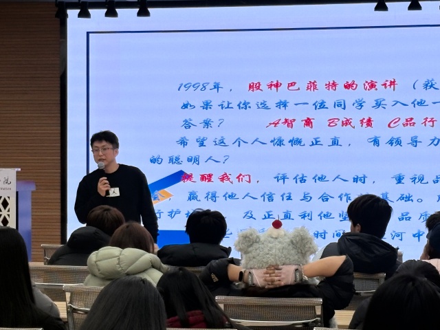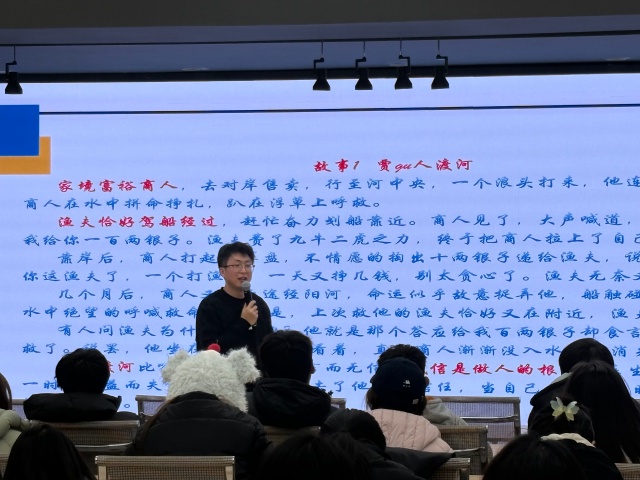 在价值引导环节,郝琛琛老师引用1998年巴菲特关于“投资同学10%收入”的演讲设问,引发学生对品行、性格与习惯的深度思考。通过“贾人渡河”寓言,他阐明诚信是立身之本,失信将导致信任崩塌与人际孤立。同时,他提出“环境→观念→行为→习惯→性格→命运”的成长逻辑链,鼓励学生从日常点滴做起,构筑个人品行的“护城河”,以正向品格支撑长远发展。
