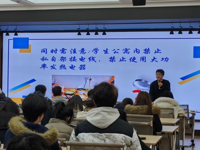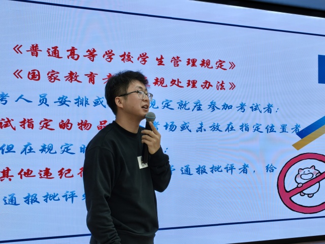 活动伊始,郝琛琛老师以近期校园内发生的典型违规案例为切入点,通过真实案例敲响纪律警钟。随后,他逐条剖析考试违纪的处分标准,明确划定了考试纪律的“高压线”。同时,针对学生公寓管理,他详细阐述了晚归、夜不归宿的分级处理规则,以及宿舍内酗酒赌博、私拉电线、使用违规电器、饲养宠物等行为的处分措施,进一步明确了公寓生活的行为规范。