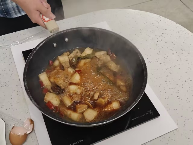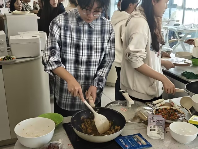 锅铲与铁锅碰撞出清脆的节拍,一场热闹的厨房盛宴正式拉开帷幕。掌勺的同学有条不紊地颠勺翻炒,油星滋滋作响,嫩滑的肉丝与鲜脆的青椒碰撞,瞬间迸发出香气;另一边,炖煮的汤锅咕嘟冒泡,五花肉、辣椒、萝卜在文火慢煨中渐渐相融,暖融融的热气裹着肉香弥漫开来。同学们围在灶台边,有的递调料,有的出主意,还有的忍不住伸手偷尝一口刚出锅的菜品,惹得大家笑作一团。升腾的锅气里,藏着同学们的热烈与默契,也藏着初雪天里最暖的烟火滋味。