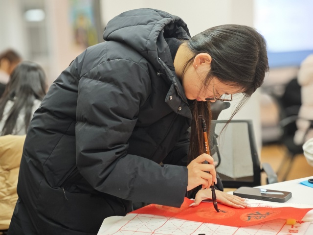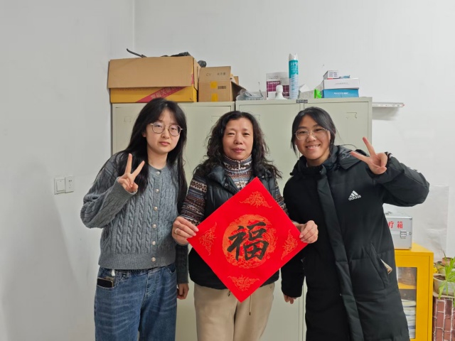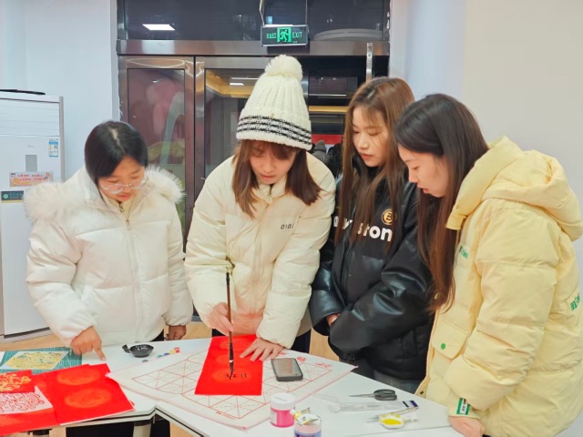 成果传递环节温情满溢。同学们分组行动,带着装裱精美的剪纸作品和手写春联,走访办公室、校园服务岗,向辛勤耕耘的教职工、默默付出的后勤人员当面送上新春祝福,让红纸墨香装点校园角落,让非遗文化在新春氛围中传递温情与活力。