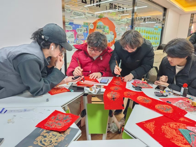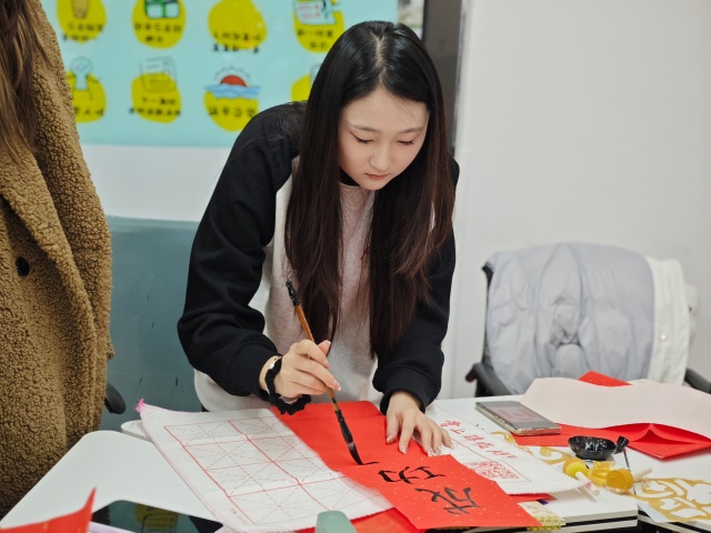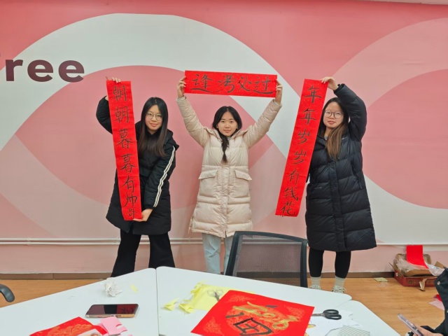 剪纸组的同学们巧思不断,指尖翻飞间,剪刀在红纸上勾勒出一幅幅寓意美好的作品。同学们不仅仅局限于传统的剪纸,还有彩纸拼贴,彩色的纸片在同学们的创作下变成了一幅幅生动的作品。而另一边,春联组的同学们挥毫泼墨,用工整的字迹书写对教职工的谆谆教诲、对校园工作人员默默奉献的敬意,笔墨流转间尽显传统文化的雅致韵味。创作过程中,同学们相互交流技巧、分享灵感,欢声笑语中,非遗实践成为拉近彼此距离的纽带。