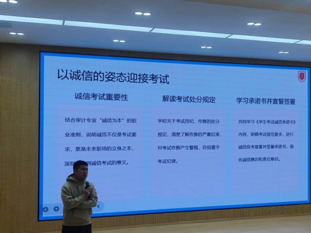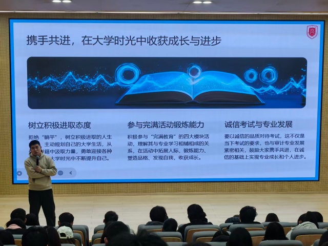 青春逢盛世,奋斗正当时。“躺平”不是佛系淡然,而是逃避责任的消极退缩;青春不是用来挥霍的资本,而是用来奋斗的黄金时期。为引导大一新生坚定理想信念,摒弃“躺平”心态,深化对诚信考试的认知与坚守,解锁完满教育的多元价值,12月17日15:00-16:00,淬炼商学院·国际商学院2025级审计2501-2506班主题年级会在ST报告厅举行。辅导员王军御老师带领249名学子齐聚一堂,以“别‘躺平’啦!诚信C位&志愿达人来Battle!”为主题,开启了一场兼具思想深度、情感温度与实践力度的成长赋能之旅。