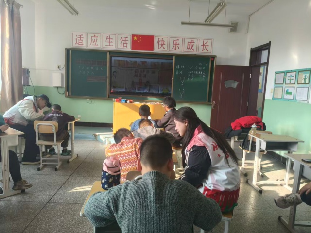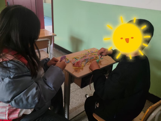 活动当天,志愿者们怀着温柔的期待、真诚的关爱以及想要陪伴特殊儿童快乐创作的心情走进教室。他们拿出提前准备好缤纷的创作材料,主动用亲切的话语引导孩子,正是这份心意的直接体现。将五彩的油画棒、柔软的扭扭棒、洁白的画纸一一摆上课桌。教室墙面“我与祖国共成长”的标语,与桌上缤纷的创作材料相映,瞬间营造出轻松又充满创意的氛围。“小朋友们,今天我们要当小画家,用彩笔涂出自己喜欢的彩虹,还用扭扭棒做出可爱的小手工哦!”志愿者们举起色彩鲜艳的材料,温柔的话语立刻抓住了孩子们的目光。有的孩子好奇地伸手触摸扭扭棒,有的盯着油画棒的色彩目不转睛,还有的小手轻轻摩挲画纸,眼中藏着对创作的期待与一丝腼腆。