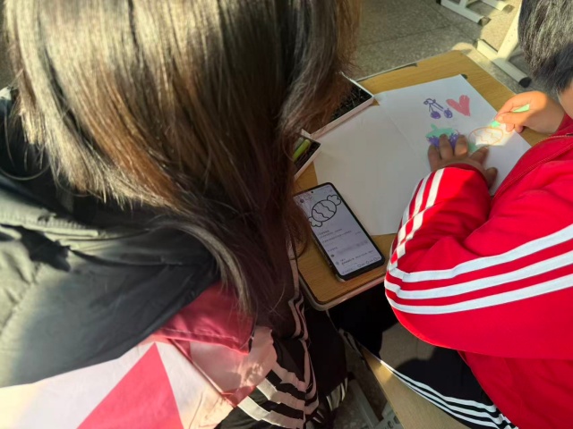 暖光里,志愿者的身影与孩子们的小脑袋挨在一起,成了教室里最温馨的画面。有的孩子用大片的橙黄涂出“太阳”,有的用蓝绿交织画下“大树”,还有的把扭扭棒拧成五彩的小花,举到志愿者面前展示。画笔划过画纸的沙沙声、扭扭棒的弯折声,伴着志愿者的引导与夸赞,汇成了创意工坊里最动人的旋律。