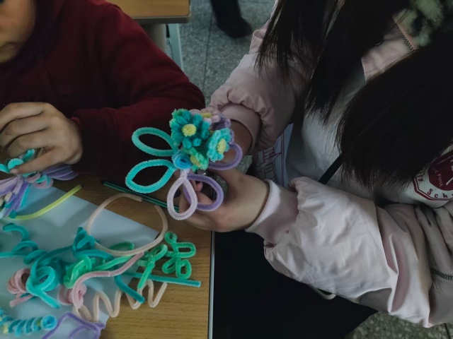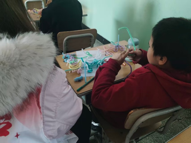 随着创作的深入,孩子们渐渐从拘谨变得大胆。有的孩子拉着志愿者的衣角,指着画纸上的色彩分享;有的孩子把做好的扭扭棒小花别在志愿者的衣服上;还有的孩子虽然没有言语,却把涂满紫色的画纸轻轻推到志愿者面前,眼中满是期待。志愿者们始终蹲身倾听、微笑回应,用“这个颜色搭配真好看”“你的小花做得太精致了”的话语,让孩子们在肯定中愈发放开手脚。有孩子将红、橙、黄、绿、蓝层层涂在纸上,说这是“心里的彩虹”;还有孩子用扭扭棒做出歪歪扭扭的小人,说是“和志愿者姐姐一起玩”,稚嫩的创意里藏着最纯粹的美好。