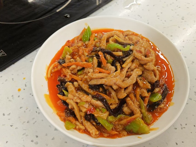在烹饪过程中,同学们遇到了不少难题。陈锦遥同学在做鱼香肉丝时,因为掌握不好火候,导致豆瓣酱炒得有些糊,急得她额头直冒汗。旁边的同学见状,立刻过来帮忙指导:“炒豆瓣酱要用小火,还要不停地翻炒,这样才不会糊。”在大家的互相帮助下,陈锦遥同学终于成功炒出了色泽红亮、香气扑鼻的鱼香肉丝。而在创意菜小组,同学们则大胆尝试,将芝士片融入到青椒炒肉中,没想到咸香的肉片搭配上芝士的浓郁,碰撞出了意想不到的美味。