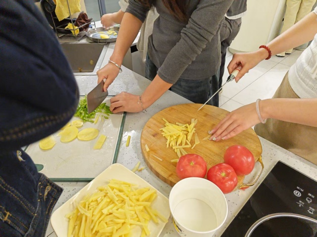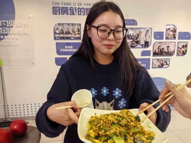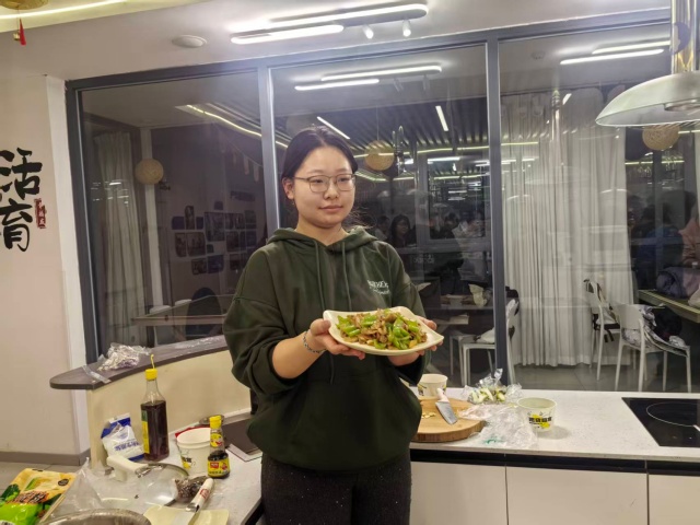 会做饭的同学们也全程在旁指导,从食材的处理技巧到调料的精准配比,从火候的把控到装盘的美学,耐心地为同学们答疑解惑。“我们平时学习任务重,很少有机会接触烹饪,这次活动不仅能让他们学会几道家常菜,更能让他们体会到‘自己动手,丰衣足食’的乐趣。”梁倩倩表示。