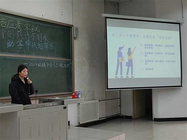 第三关“手册研学”则聚焦校规红线,辅导员弓思敏绘制了一份“避雷地图”:学业上,挂科超三分之一将触发一级预警,累计两次或挂科超二分之一需留级;宿舍管理中,热得快、电水壶等违规电器首次警告没收,第三次可能被开除,夜不归宿、饲养宠物也有明确处分标准;完满教育8个必修学分需覆盖四大板块,未修满将影响毕业。她还结合入党流程、校长信箱求助渠道等实用信息,鼓励同学们遇到问题及时沟通。