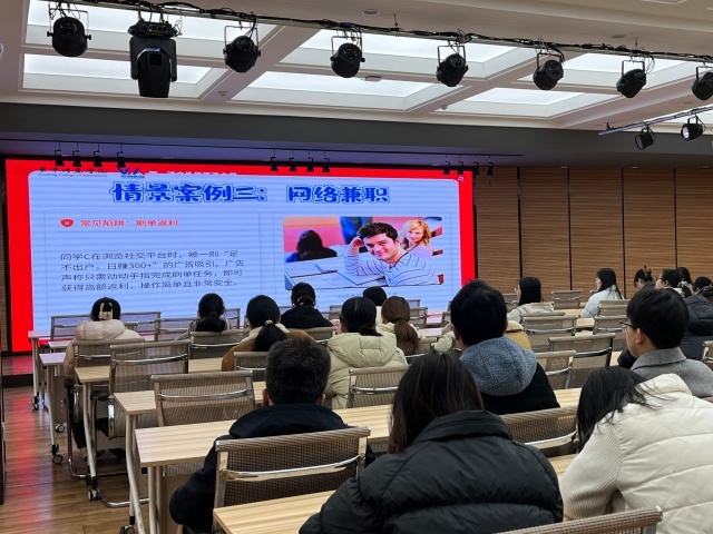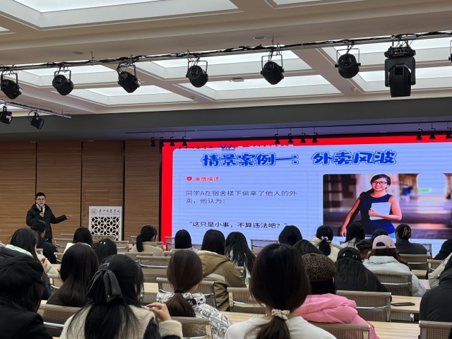 针对宿舍楼下偷拿外卖的行为,赵敬宇老师明确指出,此类看似“小事”的行为实则属于盗窃,可能会面临警告、罚款等处罚,提醒同学们勿以恶小而为之;对于考试作弊的案例,赵敬宇老师区分了校内考试与国家考试的不同后果,校内考试作弊会受到取消成绩、记过等校纪处分,而国家考试作弊则涉嫌刑事犯罪,将留下终身案底,直接影响考公、就业等未来发展,让同学们深刻认识到诚信考试的重要性;面对网络兼职中的刷单返利陷阱,赵敬宇老师拆解了诈骗分子的惯用手段,说明刷单不仅会造成财产损失,还可能因参与虚假交易触犯法律,告诫同学们远离各类违规兼职,通过正规渠道积累实践经验。