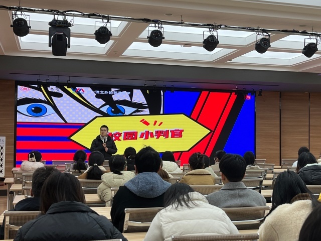 随后,赵敬宇老师以“校园小判官”的形式,结合三个真实情景案例,为同学们敲响法律与规则的警钟。