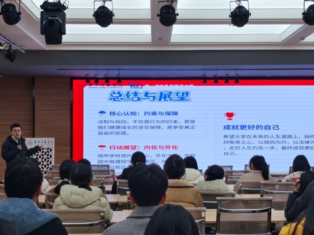 活动最后,赵敬宇老师对此次活动进行总结。他希望同学们将规则与法律意识内化于心、外化于行,在规划大三下学期的学习与生活时,既要树立明确的目标,制定详实的计划,更要始终保持对法律与规则的敬畏之心。