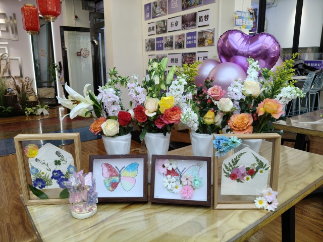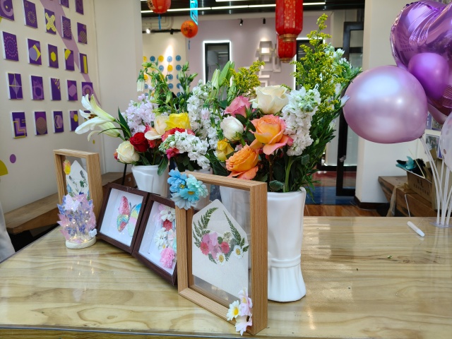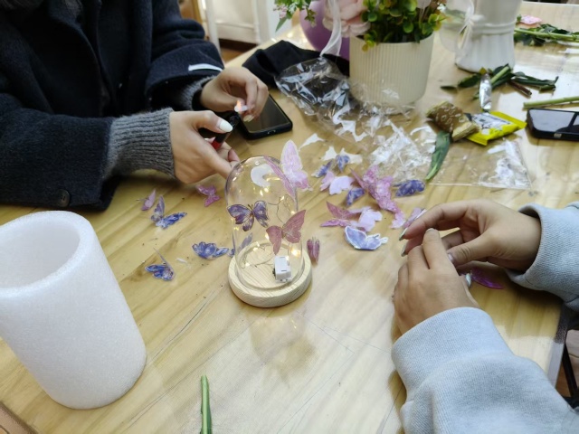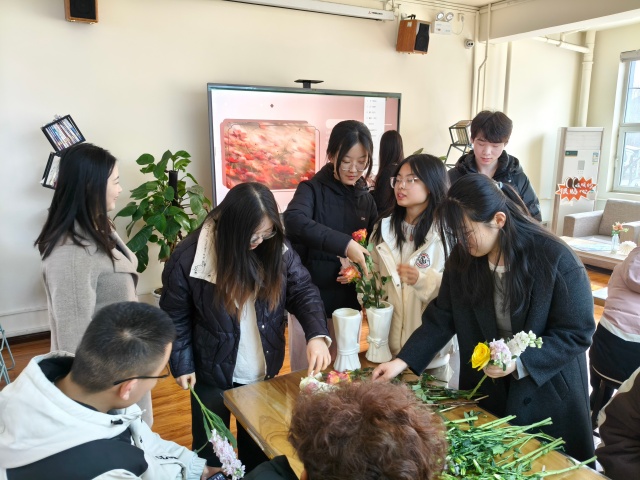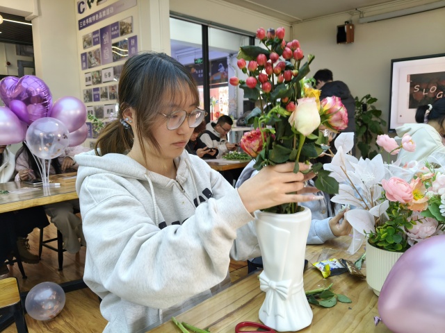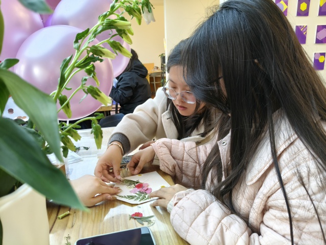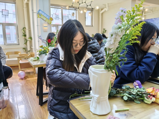 “哎呀,你这朵花放这里更好看!”“快帮我看看,是不是歪了?”大家一边忙活,一边互相“串门”指点,活动现场秒变大型闺蜜茶话会。原本不太相熟的同学,因为一朵干花打开了话匣子;平时严肃的同学,此刻笑得像个孩子。这一刻,花是媒介,连接起一颗颗年轻而鲜活的心。那些平时没机会说出口的赞美,那些不经意间的互助,都化作了比花香更暖心的气息,在教室里弥漫开来。
