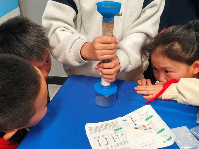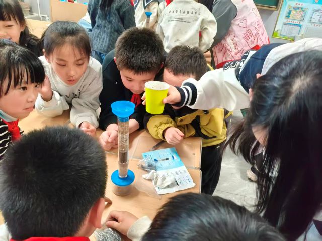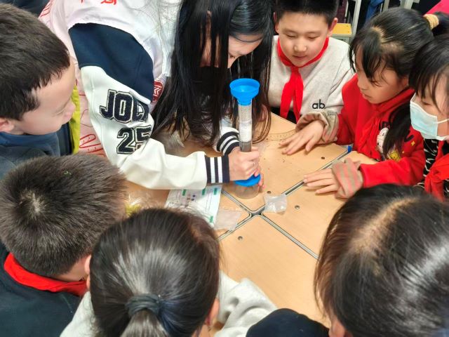 活动现场充满了好奇与探索的气息。同学们围坐在实验桌前,眼神专注地盯着手中的材料,小心翼翼地搭建自己的净水装置:有的孩子仔细调整石英砂与活性炭的分层厚度,有的孩子屏息观察浑浊水样通过滤层后的变化,当第一滴清澈的水滴从装置底部滴落时,教室里响起了阵阵欢呼与惊叹。志愿者们穿梭在课桌间,耐心解答孩子们的疑问,手把手指导操作细节,与孩子们一同见证科学的魔力。课堂上,孩子们踊跃举手分享自己的发现与感悟,从“原来脏水可以变干净”到“我以后要节约用水”,稚嫩的话语里满是对环保的理解与决心。一张张洋溢着笑容的脸庞,一双双充满好奇的眼睛,成为这场科普活动最动人的风景。