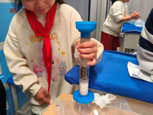 活动伊始,志愿者以生活中的水污染现象为切入点,用生动的语言向孩子们讲解了水资源分布、污染成因及净水的重要性,随后带领大家利用塑料瓶、纱布、石英砂、活性炭等简易材料,亲手制作微型净水器。从材料分层铺设到装置组装,从浑浊水样倒入到清澈水流流出,孩子们一步步见证了“污水变清”的神奇过程。志愿者们结合操作步骤,细致讲解了物理过滤与活性炭吸附的核心原理,让抽象的化学知识变得可感可知。