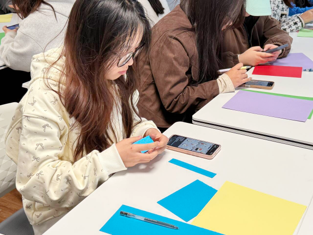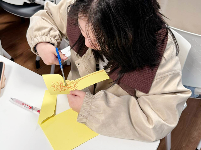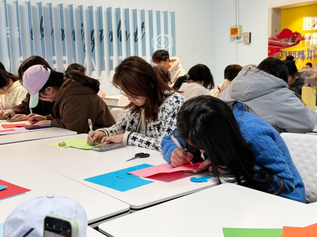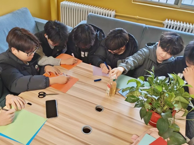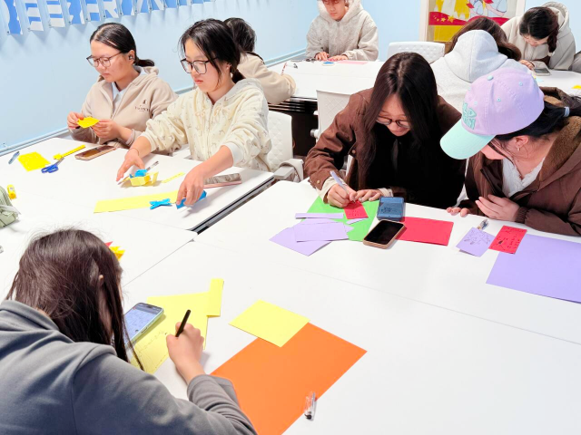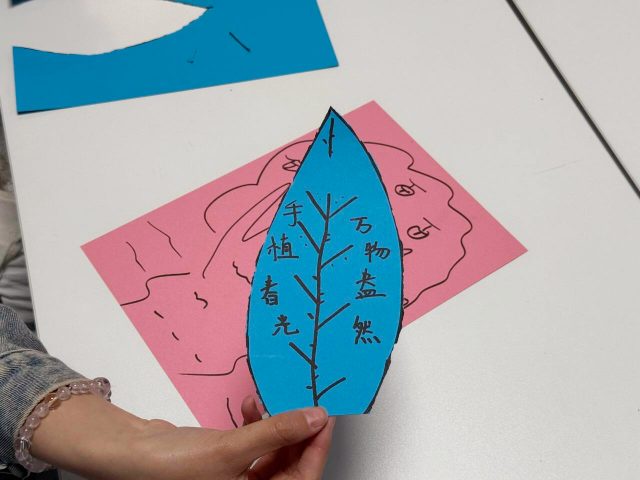 制作过程中,同学们三两成群,交流着创意与技巧,欢声笑语与剪刀裁剪的声音交织在一起。有的同学在挑选树叶时精挑细选,只为找到最完美的那一片;有的则在同伴的建议下,尝试将不同颜色的叶片进行搭配,碰撞出意想不到的视觉效果。司佳琪在完成自己的作品后,高兴地向身边的同学展示,眼中闪烁着自豪的光芒。大家纷纷在书签上写下对未来的期许,一句句真挚的祝福,不仅是对春天的礼赞,更是对共建美好家园的青春誓言。
