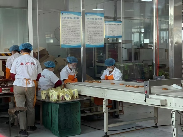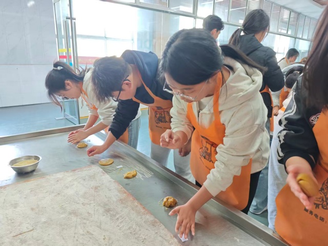 走进生产体验区,现代化的生产车间展示了太谷饼制作的关键工序,精准的原料配比、恰到好处的揉面力道、拿捏有度的饼形塑造。观摩结束后,同学们分组开启实操体验,在讲解者的耐心指导下,从称量面粉、调和原料开始,一步步揉面、擀皮、包馅、压饼,沉浸式体验太谷饼的制作全过程。文化园里满是欢声笑语,面团在指尖揉捏的过程,也让大家将晋商文化的积淀与非遗技艺的匠心揉进了方寸饼坯中。