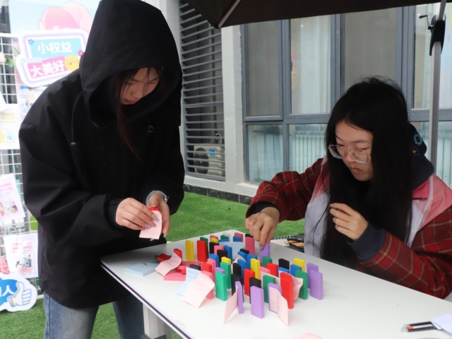 解忧多米诺环节温情登场。同学们将校园生活中的权益烦恼、参与活动的收获与感悟写在便利贴上,整齐贴满多米诺骨牌。当大家一同推倒骨牌的瞬间,不仅是烦恼的清零,更是对权益守护的共同承诺,仪式感拉满且意义深远。活动结束后,吕慧老师与学生代表第一时间梳理同学们反馈的问题,前往相关部门进行反馈,真正做到从“听见问题”到“解决问题”,一步不落、一环不松。真正把服务送到同学们心坎上,用行动诠释“权益守护不打烊”。