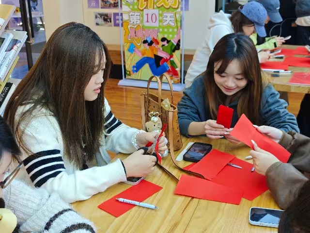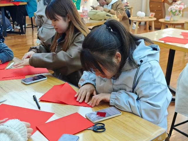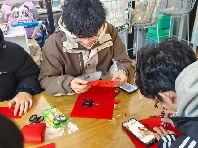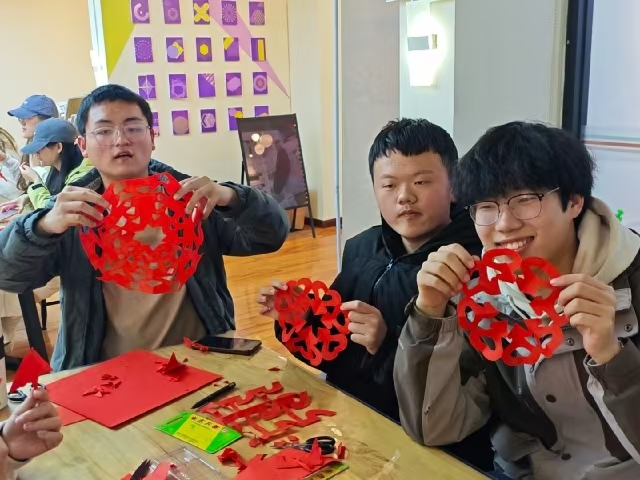 片刻后,红纸在指尖慢慢成形,既有大院、窗花、民俗图案等传统元素,又带着年轻人独有的灵动与巧思。这一环节,让同学们在亲手创作中真正走近地域文化,在思考与实践中理解非遗技艺的价值,既锻炼了动手能力,也让传统文化在青春的表达里焕发新生,真正实现了非遗技艺的代际传递。