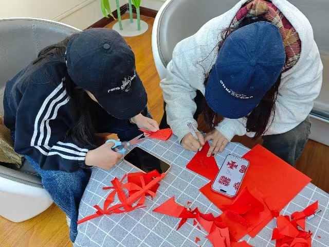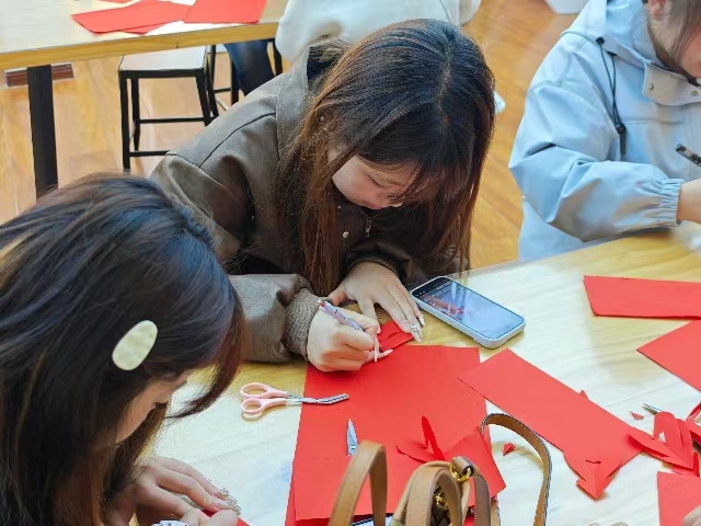 活动最后,全场迎来最具气势的剪纸大比拼。同学们以小组为单位围坐在一起,正式展开剪纸比拼。现场安静时只听见剪刀与彩纸摩擦的沙沙声响,同学们纷纷低头凝神创作,神情专注而认真,指尖在纸上灵活翻转,每一刀都细致谨慎,生怕破坏了手中的作品。遇到难题时,大家便凑近一起轻声交流技巧,互相指点、耐心示范,你一言我一语,在切磋中不断完善作品。