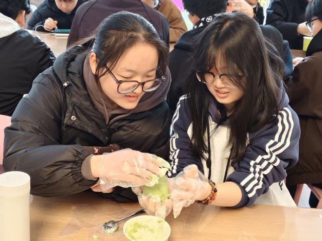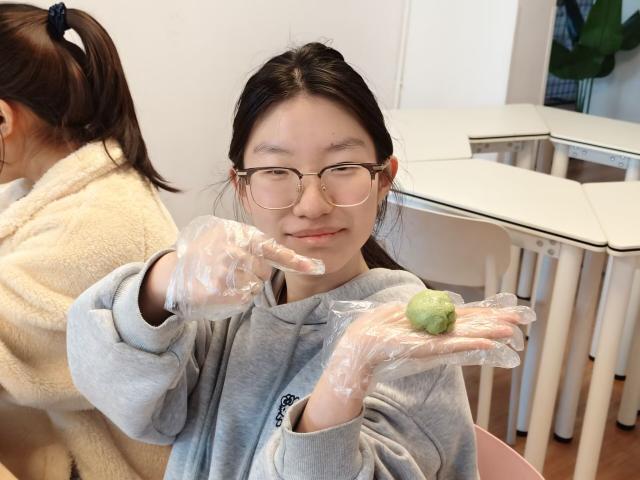 随后青团制作正式拉开帷幕,同学们分组协作,撸起袖子投入创作,现场瞬间充满欢声笑语,同学们沉浸在创作的乐趣中,有的精心调配馅料,将甜咸风味完美融合;有的反复揉搓面团,追求极致软糯的口感;还有的创新造型,让普通的青团多了几分灵动的趣味。每个小组内馅的口味各不相同,同学们进行了交换,品尝不同风味。此时,房间已成为天然的展示台,同学们举着自己的作品合影,这不仅是一次美食制作,更是一场青春的创意集市,大家在交流中交换手艺,在欢笑中增进情谊,一捏一揉间拉近了彼此的距离。