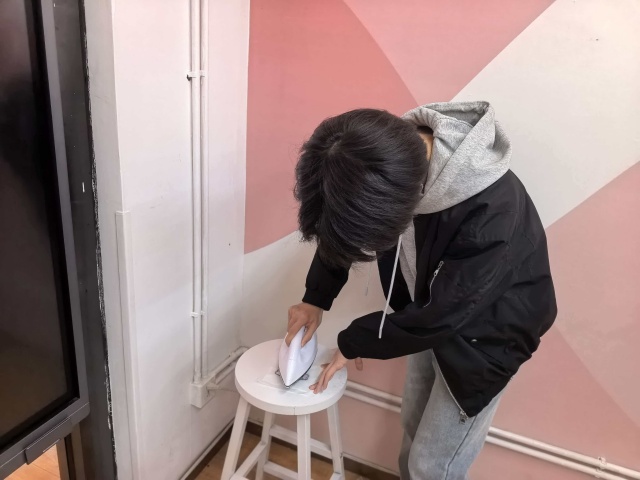 活动一开始,教室里瞬间安静了三分,只剩下镊子敲击模板的“嗒嗒”声。但这份安静没撑过十分钟,就被此起彼伏的“求助信号”打破。“紧急求助!我的‘美乐蒂’少了三颗浅粉色,有没有哪位‘仁兄’愿意支援?”;“我不小心撒了,咋整啊?我不得劲!”;“我拼错行了,又要重新开始了,要抓狂了!”这些不同的小插曲也为本次活动提供了很多笑料,欢声笑语响彻整间教室。最有意思的是,大家的作品彻底跳出了卡通模板的“舒适区”,同学们尽情发挥创意,脑洞大开,有把自己的照片发给豆包生成的卡通形象,有同学全凭感觉创作,大家都天马行空,极力展现自己的“美商”。当然,翻车现场也少不了,成为了活动最欢乐的“缓冲地带”。有为了追求“高端质感”,结果熨的时候温度没控制好,原本漂亮的图案,直接变成了“抽象派色块”,让大家笑的前仰后合;有熨完才发现自己原来早就拼歪了,整个图案都变成了另一个样子。熨豆环节堪称整场活动的“核心枢纽”,也是最考验“感知能力”的时刻。文艺委员特意准备了几台安全熨斗,为了整齐有序还设立了“熨烫流水线”:一人负责固定模板,一人负责控制温度,一人负责冷却定型,完美复刻了工厂的“流水线作业”,虽然还是有一两个因温度没控制好而翻车的图案,但是那个工厂没有“残次品”呢?