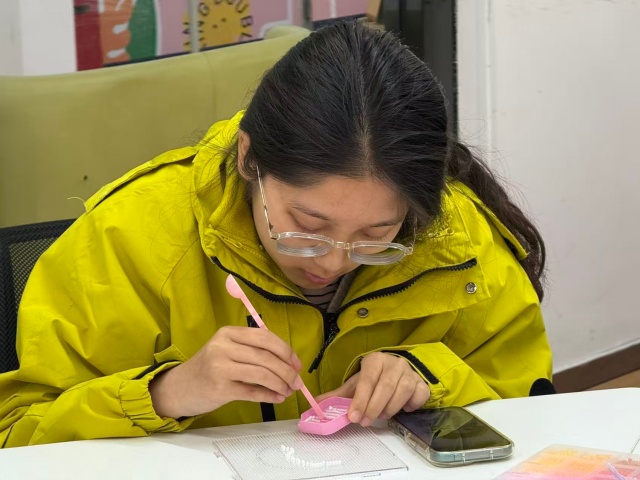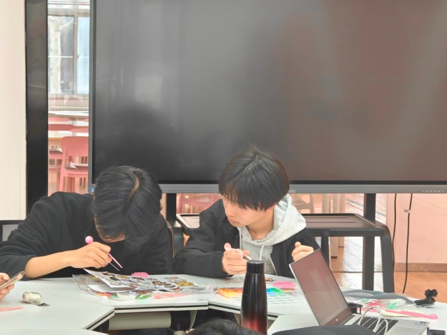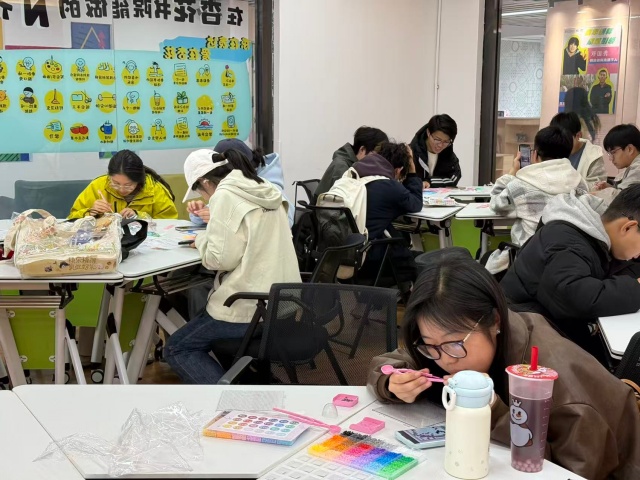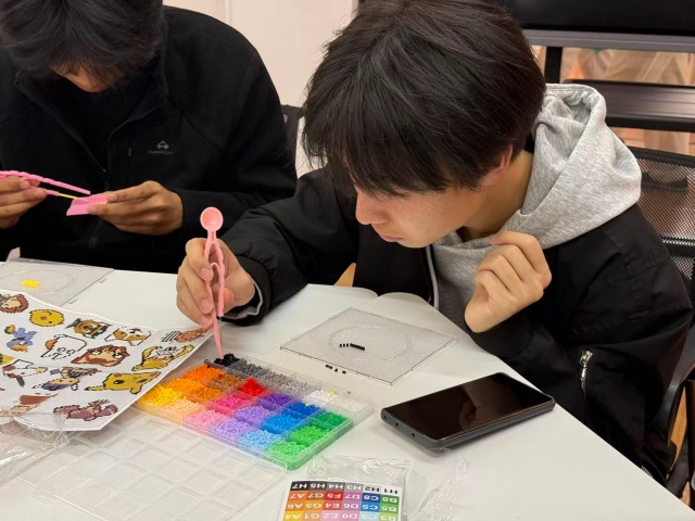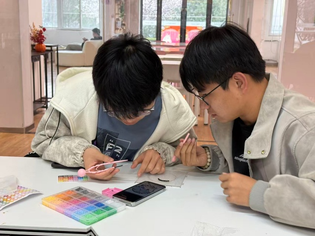 教室门刚打开,就被一股“彩虹色的烟火气”填满。文艺委员将“苦等已久”的拼豆在收纳盒按颜色码得整整齐齐,光是看着就让人赏心悦目,组织委员早已按宿舍分好组,每个组都围在一起探讨今天要拼什么,势必一鸣惊人,好让其他组都觉得自己组的“美商极高”。