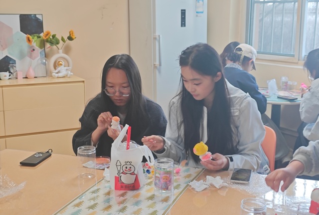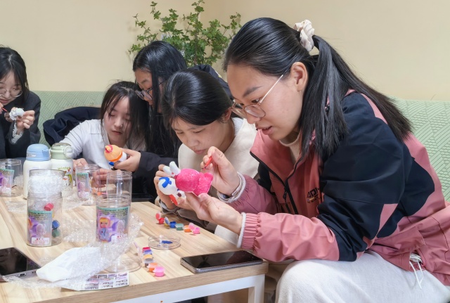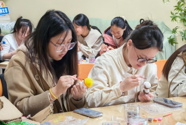 活动开始后,同学们纷纷挑选了自己心仪的石膏娃娃,围坐在一起投入创作。有的同学专注地用细笔勾勒娃娃的眉眼,神情认真又专注;有的同学大胆调配色彩,将原本素白的石膏染上明亮的蓝、温暖的粉、活泼的橙;还有的同学相互交流技巧,分享调色的小窍门,或是帮身边的同学出谋划策,让娃娃的造型更具创意。现场没有喧嚣的吵闹,只有画笔划过石膏的沙沙声、偶尔的笑声和轻声的交流,温馨的氛围萦绕在整个场地。