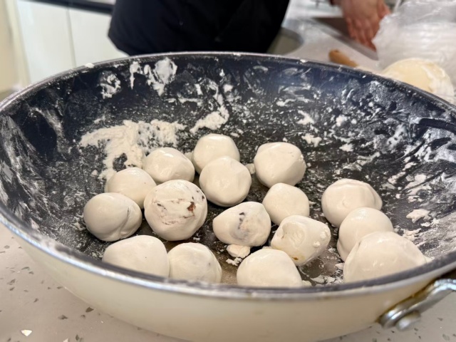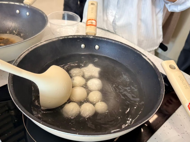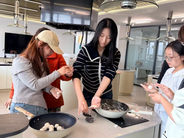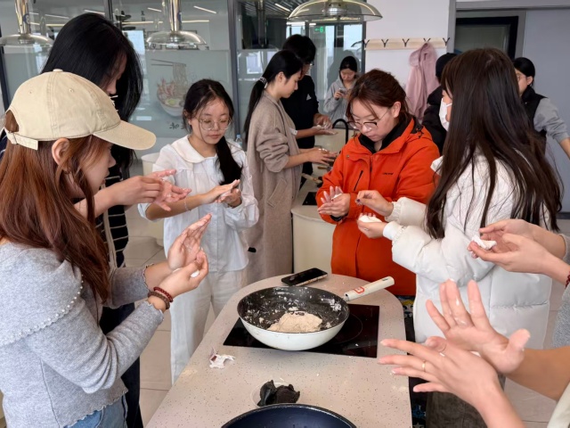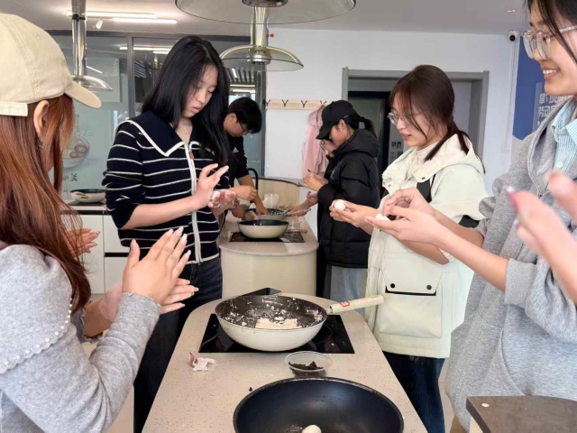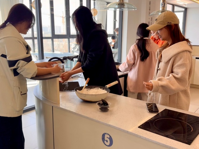 共享厨房内已是热闹非凡——案板上摆放着拌好的馅料,面盆里的糯米面也已揉匀,在盆中泛着温润的光泽,一场别开生面的“指尖传文化课”在同学们的热情中就此拉开序幕。