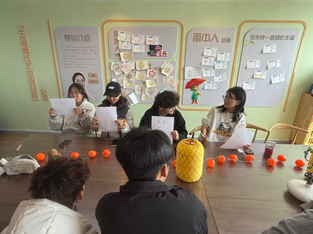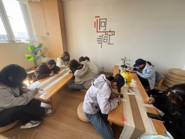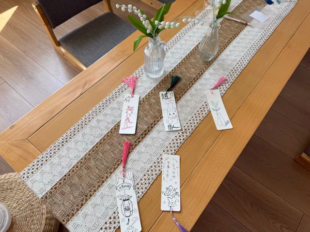 斜阳穿窗而入,案上散落着干花材料包与素白卡纸。“春景易逝,不如裁一段春色藏于书页。”众人取材料包中的樱花与小雏菊,以镊子轻夹,错落贴于卡纸一角。王嘉丽同学提笔在书签留白处写下“花影入书”,似将春日的灵气封存于方寸之间。最后,大家把书签夹进随身的书里,当书页轻合时,干花的暗香悄然溢出。