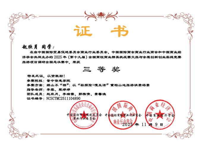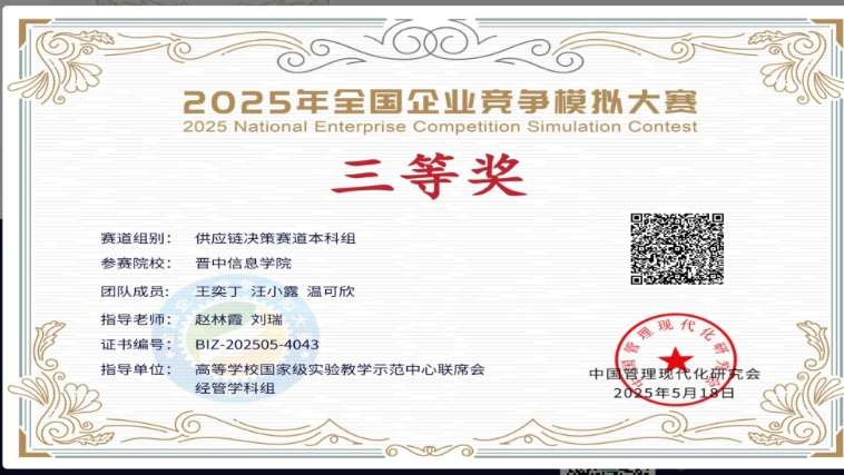 近三年学生参加全国大学生统计建模大赛、商业精英挑战赛、企业价值竞争竞赛、农产品营销模拟大赛等学科竞赛,参与覆盖率超60%,累计获奖人次达90+,斩获国家级奖项20余项、省级奖项12项。